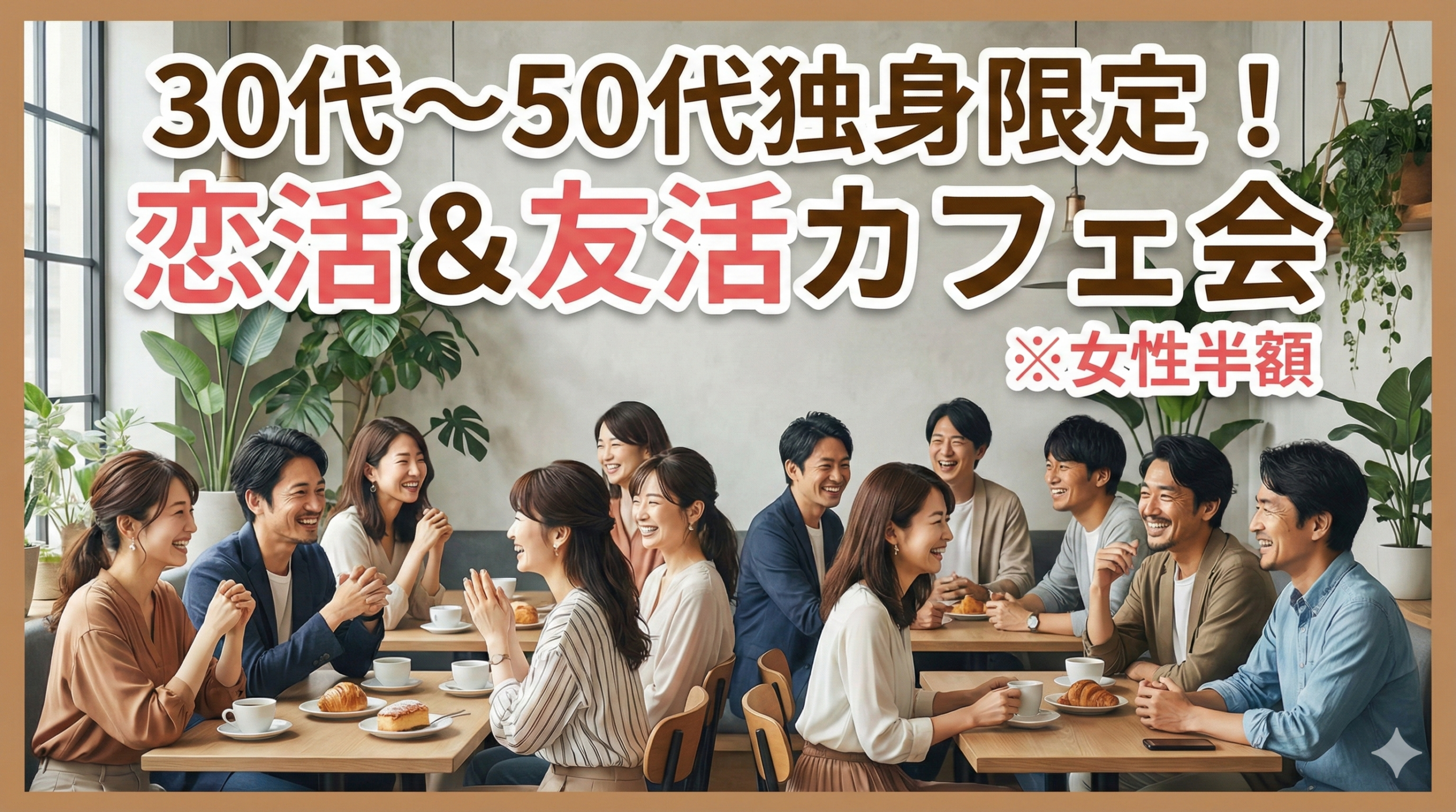 今回のカフェ会は30代~50代の独身男女対象です。バツイチの方やバツイチ理解者の方も大歓迎です^^