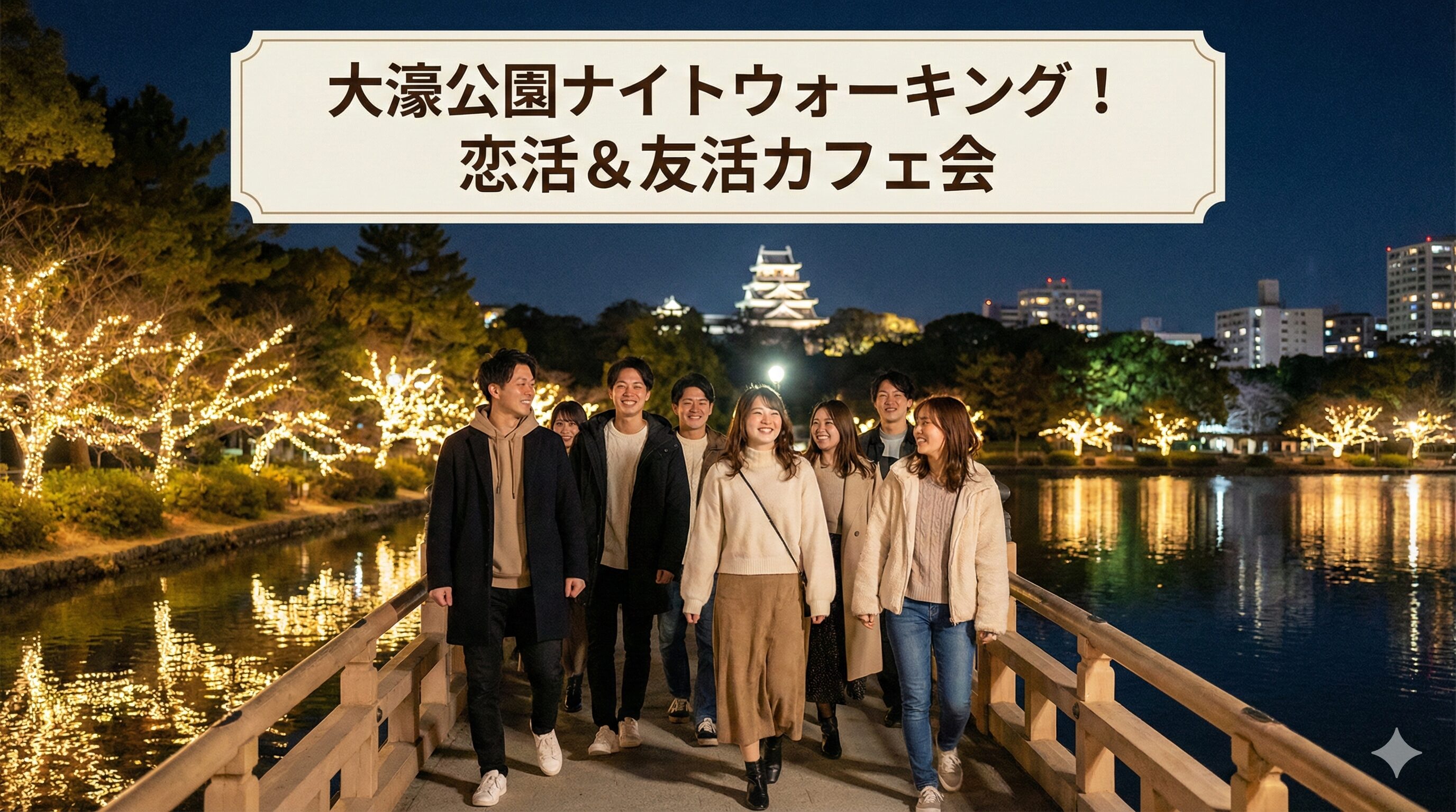 夜の大濠公園をみんなで歩きながら、自然と会話が生まれる交流イベントです。